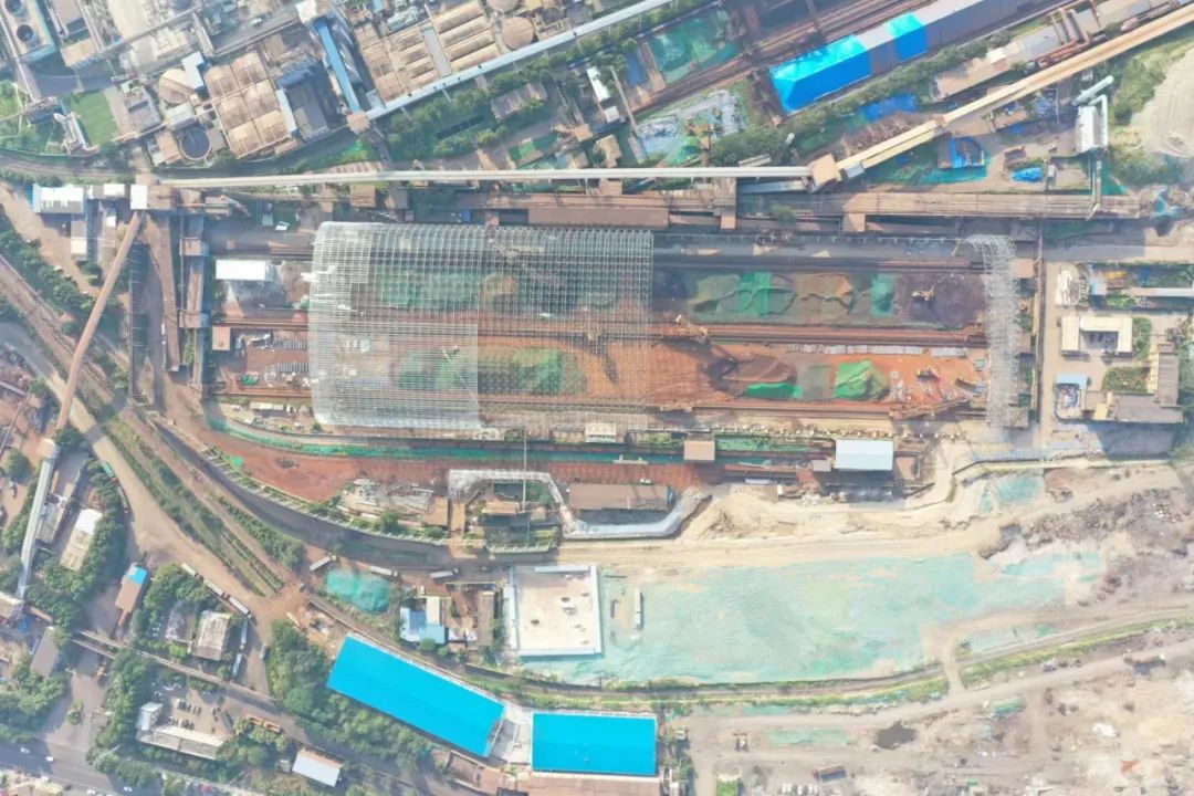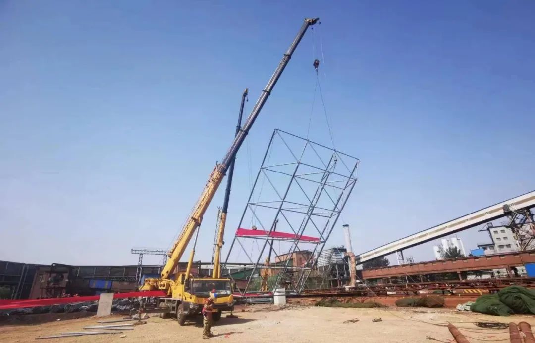 老區(qū)一次料場封閉料棚網(wǎng)架長度363米、寬度106米、高度42米,展開面積70000平方米。6月23日驕陽似火炎炎的夏日,揮汗如雨,料棚起步架順利吊裝對(duì)接完成,掀起了大干熱潮。